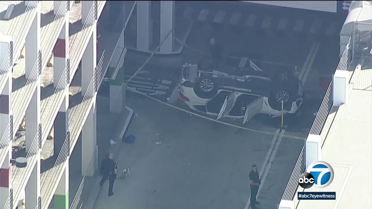 An SUV plummeted off the third level of a parking structure at the Beverly Connection shopping center in Los Angeles on Thursday afternoon, landing upside down and damaging another car. Full story: